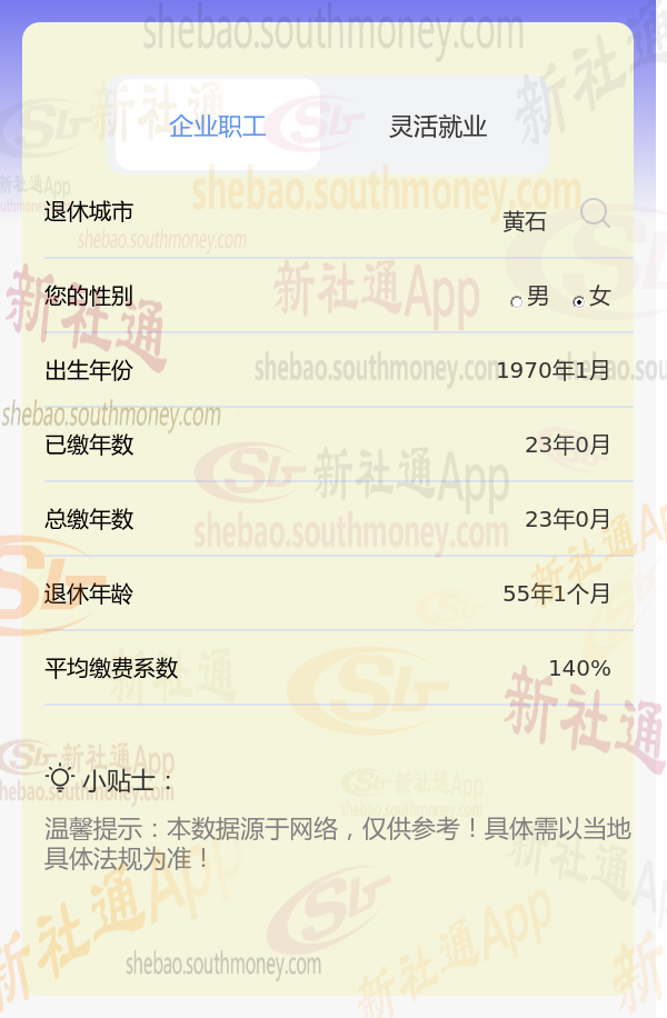 例如黄石,1970年出生女性,社保缴费档次为140%。