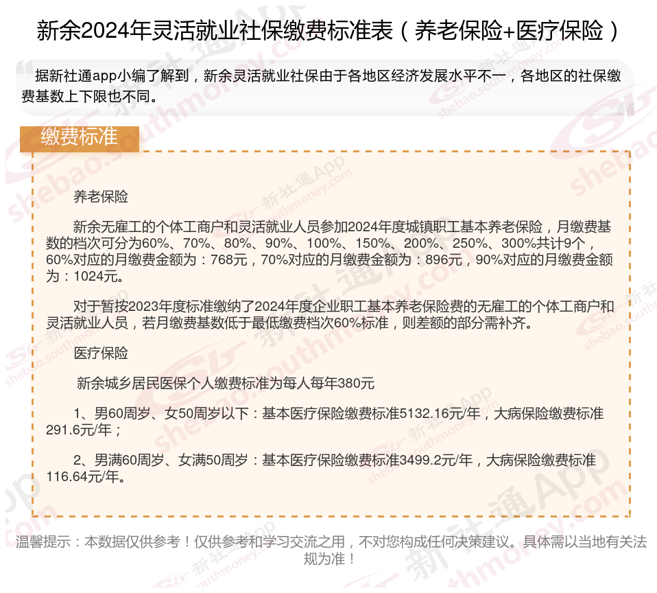 据新社通app数据显示,新余灵活就业养老缴费基数明细如下: