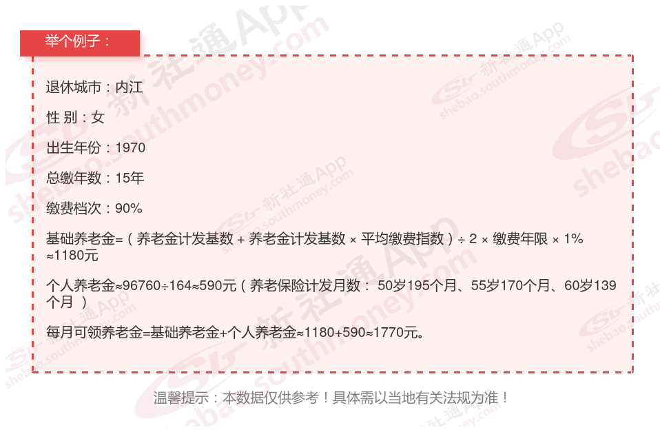 沈某,内江人,1970年出生,工龄15年,女性,缴费档次按90%。岁月流转,她终于迎来了自己的退休时光。借助新社通app养老金在线计算器计算所得: