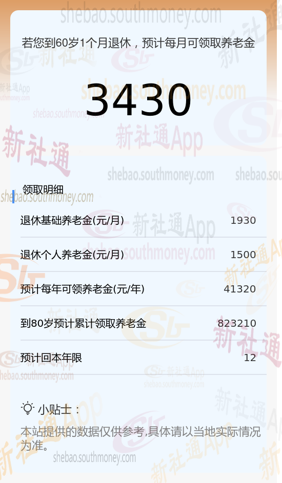 养老金总额:基础养老金 + 个人养老金 = 3430元/月。