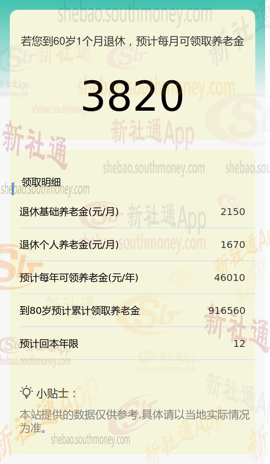 结果显示:他每月可以从个人账户中领取约1670元的养老金。将上述两部分相加,我们得出夏某每月预计可以领取的养老金总额为3820元。这一结果是由新社通app养老金计算器基于给定的参数和公式得出的估算值。