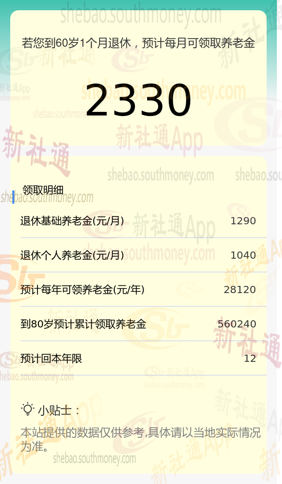 基于这些关键信息,我们使用新社通app养老金计算器对他未来的养老金进行了详细估算:
