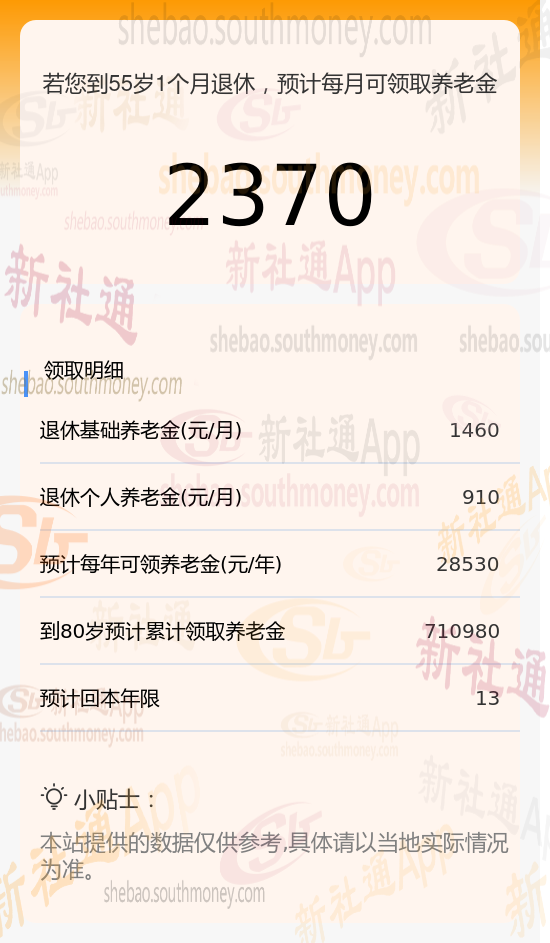 养老金总额:基础养老金 + 个人养老金 = 2370元/月。