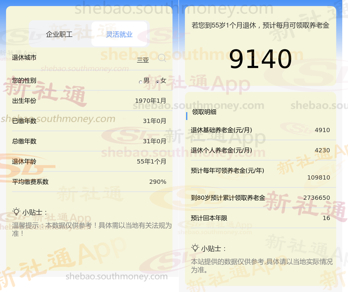朱某,拥有长达31年的养老保险缴纳年限,其缴费档次一直维持在较高的290%水平。基于这些详细信息,我们使用了新社通app养老金计算器,并参考了当前的养老保险法规,对他未来的养老金进行了如下估算: