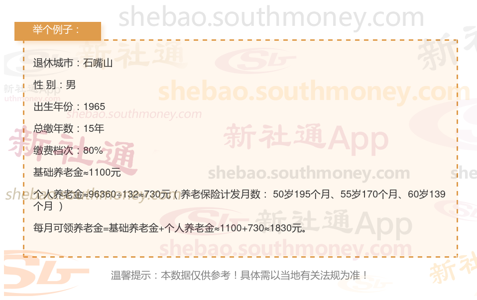 退休城市:石嘴山,性别:男,出生年份:1965,总缴年数15年,缴费档次:80%,新社通app养老金计算器所得: