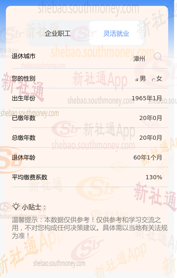 近期,有一位来自漳州的已退休男性,灵活就业社保人员通过后台询问,即将步入退休了,累计工作年限为20年。每月按照130%档位缴纳。他想知道,基于这些信息,他养老金多少钱一个月?并且是否能够达到2700元。