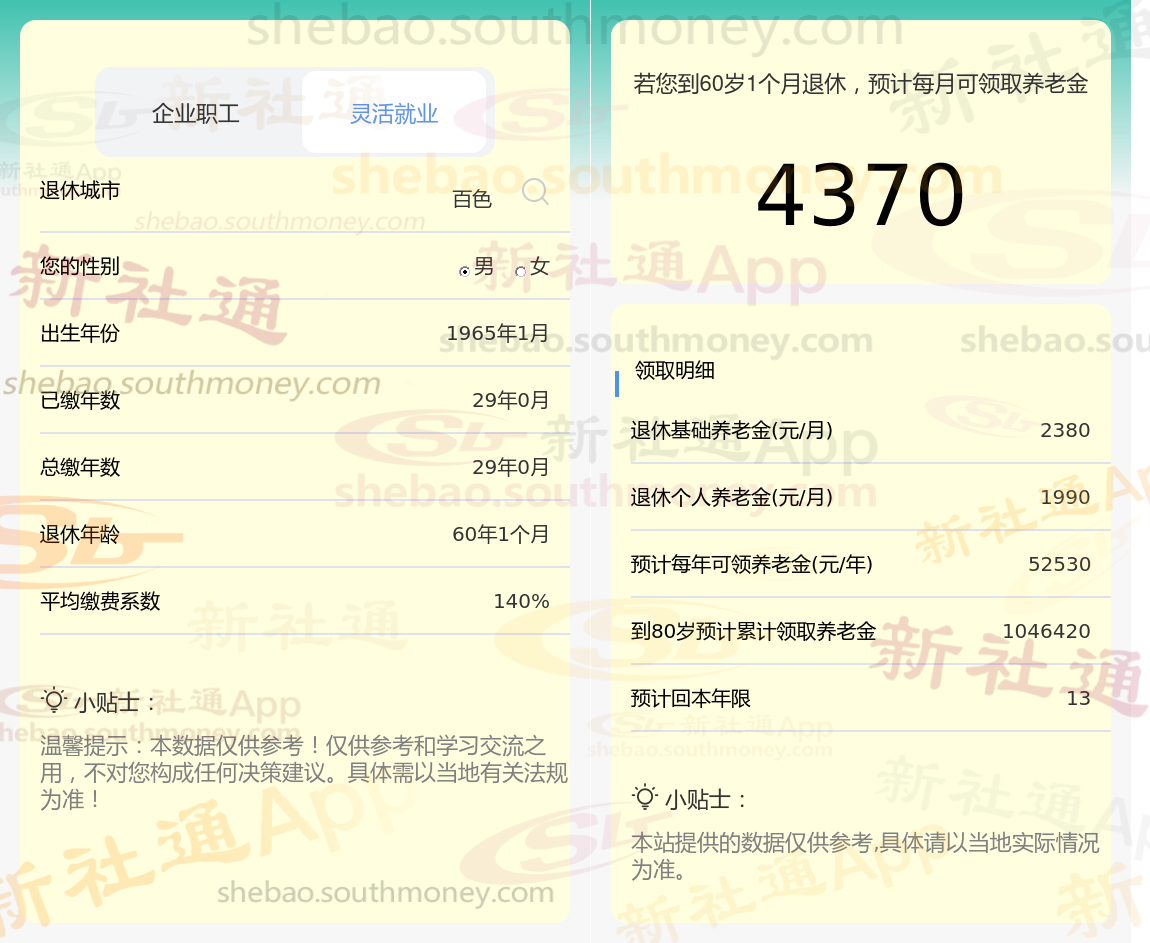 笔友谢某退休城市在百色,性别:男,出生年份:1965,总缴年数29年,缴费档次:140%,新社通app养老金计算器所得: