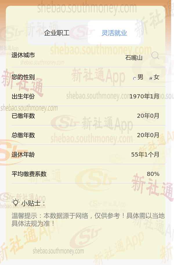 新社通app养老金计算器计算所得: