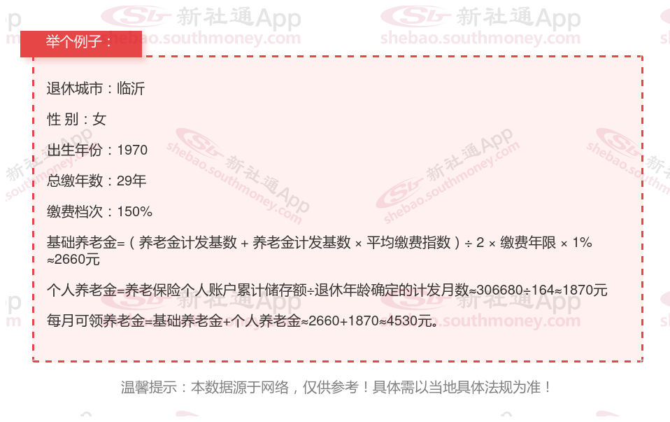 退休城市:临沂,性别:女,出生年份:1970,总缴年数29年,缴费档次:150%,新社通app养老金计算器所得: