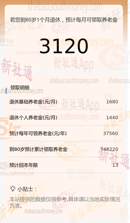 秦某,作为一位勤勉的职工,他的养老保险缴纳记录长达16年之久,且缴费档次一直保持在较高的190%水平。基于这些关键数据,我们利用新社通app养老金计算器,结合最新的养老保险法规,对其养老金进行了如下估算: