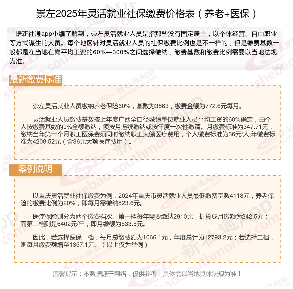 崇左灵活就业者社保缴纳金额怎么计算?根据新社通app-社保缴费查询工具提供的最新数据如下: