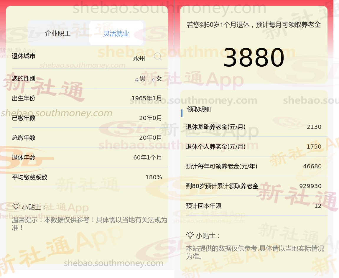 下面随着新社通APP一起来看看,湖南永州社保交满20年每月领多少钱?
