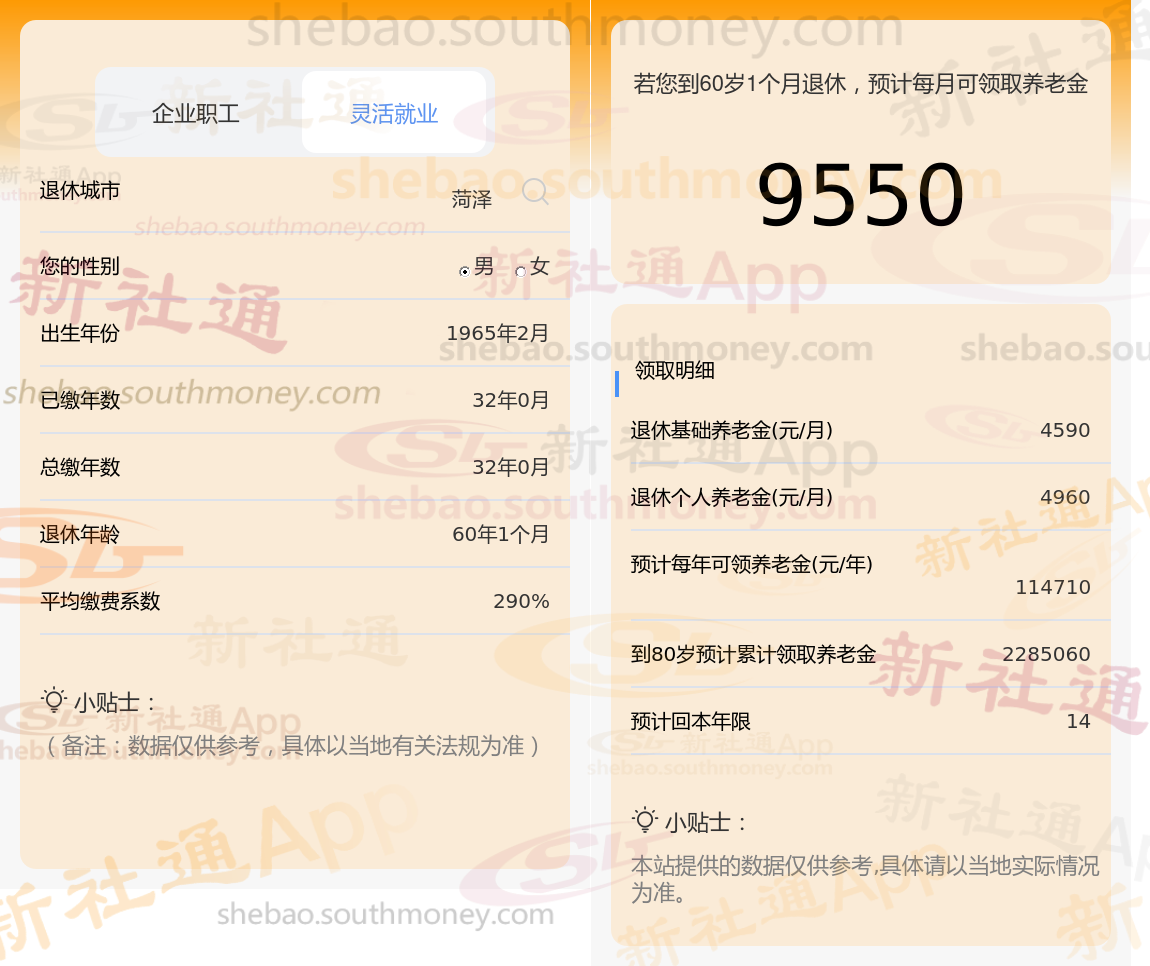 菏泽一位男性灵活就业退休人员向我们表达了他的疑问。她出生于1965年,于今年正式退休,拥有32年的工龄。这位他提到,他的养老保险一直按照按照290%档位缴纳,即290%的比例进行缴纳。他希望了解,基于这样的缴费情况,他每月能领取到的养老金数额是否能达到或超过9100元。