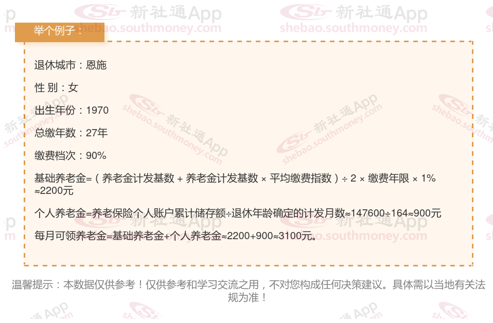 退休城市:恩施,性别:女,出生年份:1970,总缴年数27年,缴费档次:90%