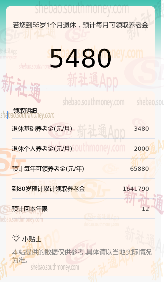 每月总共能领多少:把上面两个数加在一起,就是每个月你能领到的养老金总数啦,大概是5480元(即3480元基础养老金+2000元个人养老金)。