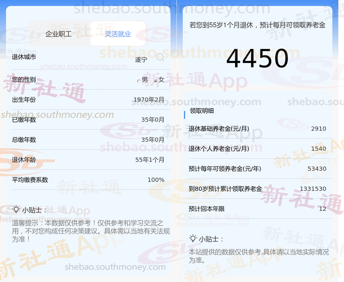 基于这些关键信息,我们使用新社通app养老金计算器对他未来的养老金进行了详细估算: