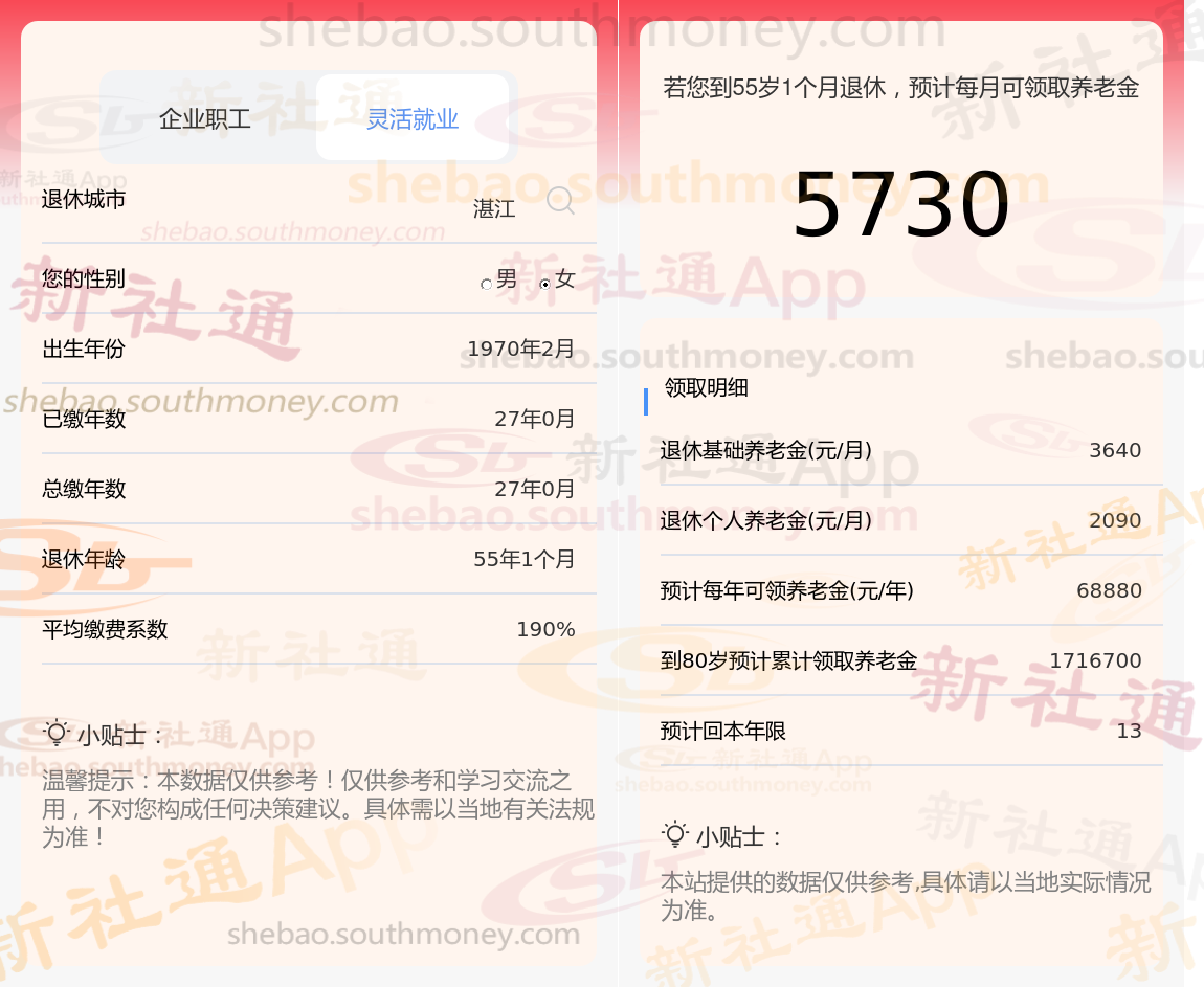 退休城市:湛江,性别:女,出生年份:1970,总缴年数27年,缴费档次:190%