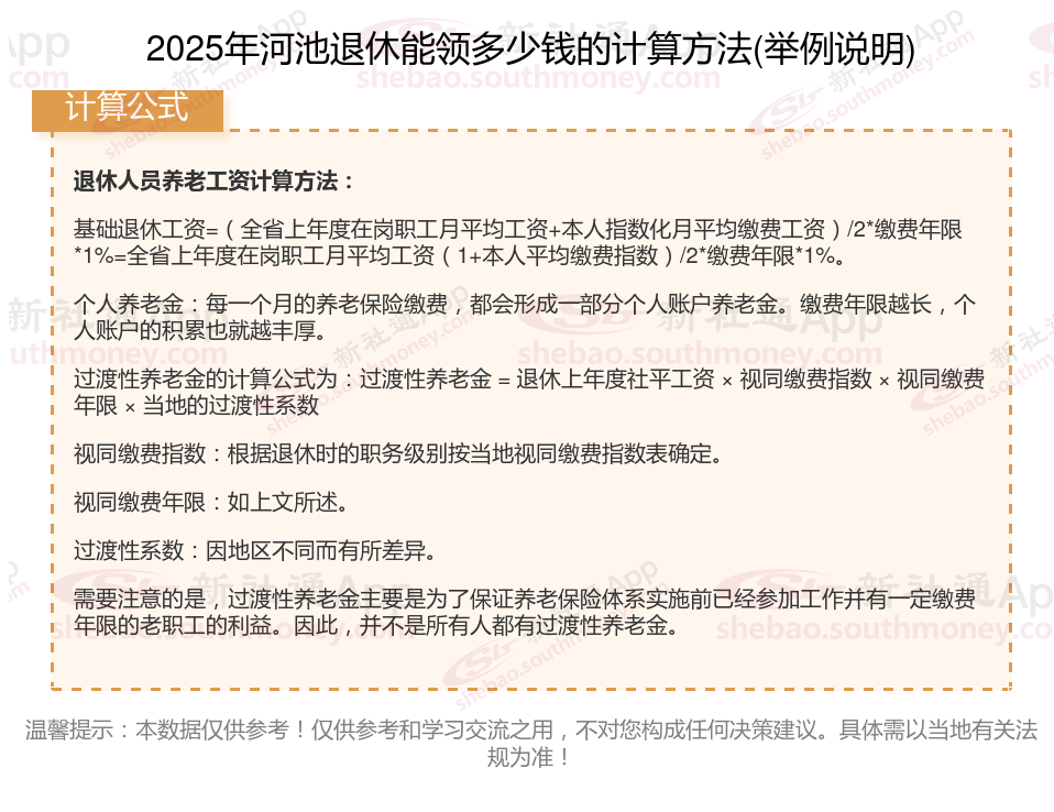 基础养老金=(退休上一年河池在岗职工月平均工资+退休上一年河池在岗职工月平均工资×个人平均缴费工资指数)÷2×累计缴费年限(含视为缴费年限)×1%。