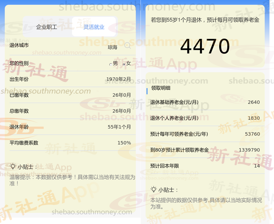 退休城市:琼海,性别:女,出生年份:1970,总缴年数26年,缴费档次:150%,新社通app养老金计算器所得: