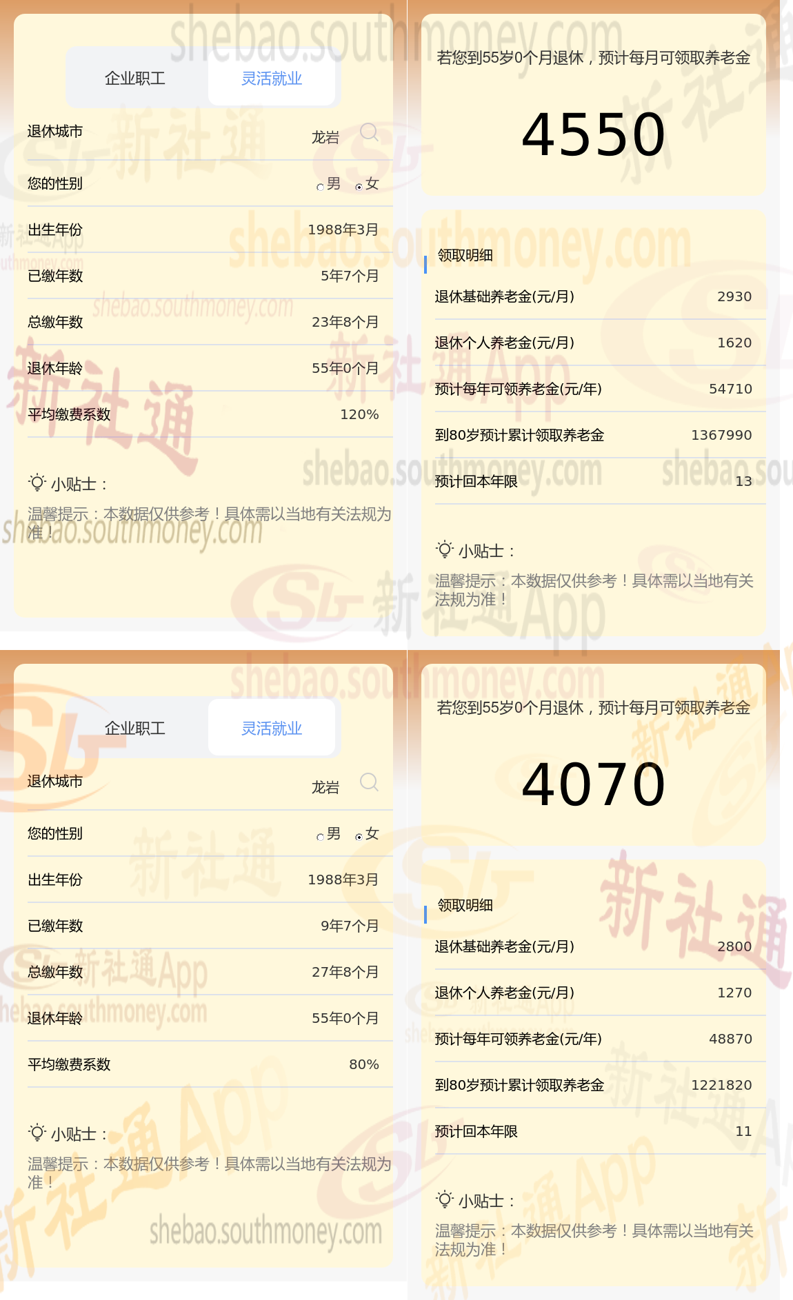 老李:退休城市龙岩,缴费年限27年,退休年龄55周岁,但是按80%缴纳社保。