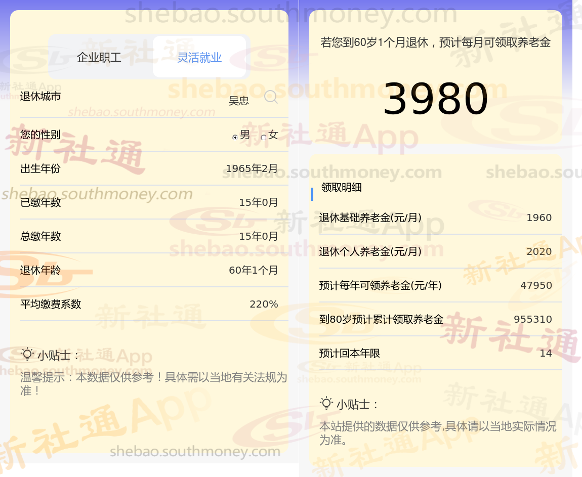 结果显示:他每月可以从个人账户中领取约2020元的养老金。将上述两部分相加,我们得出张某每月预计可以领取的养老金总额为3980元。这一结果是由新社通app养老金计算器基于给定的参数和公式得出的估算值。