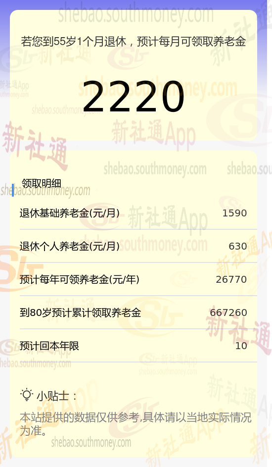 每月可领养老金总额:将基础养老金与个人养老金相加,每月可领取的养老金总额约为2220元(1590元+630元)。