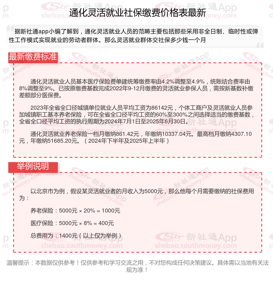 通化灵活就业人员社保缴费基数2024-2025年最新标准是多少 灵活就业交社保划算吗?下表是2024-2025年通化社保费用明细参考,根据新社通app-社保缴费查询工具提供的最新数据如下: