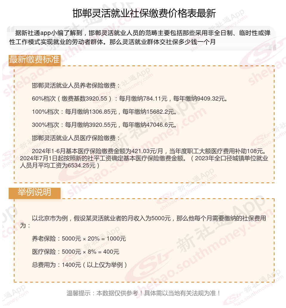 据新社通app数据显示,邯郸灵活就业人员养老缴费基数2024-2025年最新标准如下: