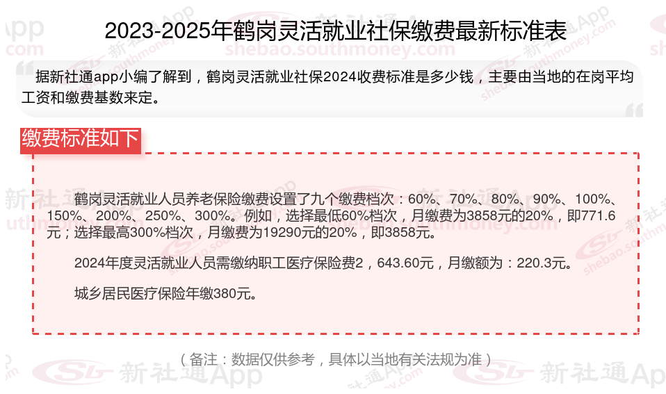 据新社通app数据显示,2024-2025年鹤岗灵活就业人员养老保险的缴费标准是根据缴费基数来确定的: