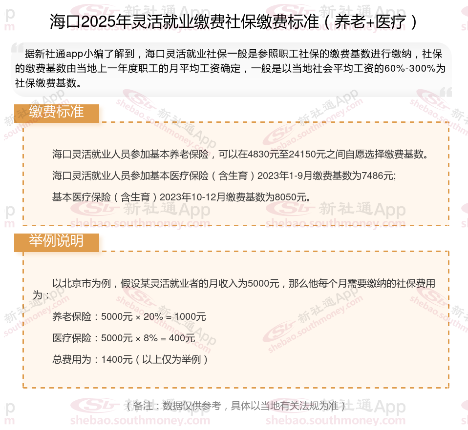 据新社通app数据显示,海口企业灵活就业养老保险的缴费基数为:4830元。