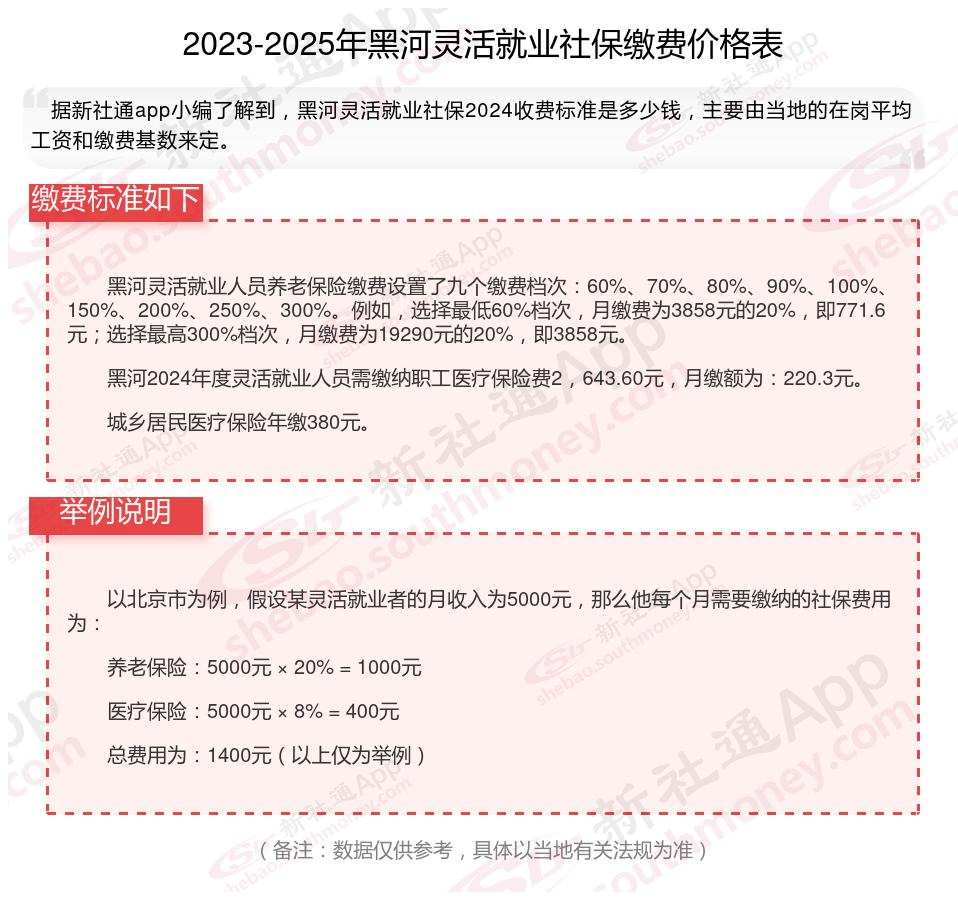 黑河灵活就业人员社保缴费基数2024-2025年最新标准是多少 灵活就业交社保划算吗?下表是2024-2025年黑河社保费用明细参考,根据新社通app-社保缴费查询工具提供的最新数据如下: