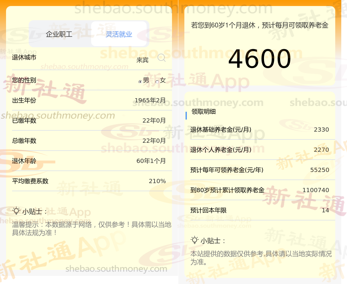 基础养老金估算:在综合考量各项因素后,基础养老金的测算金额为2330元。