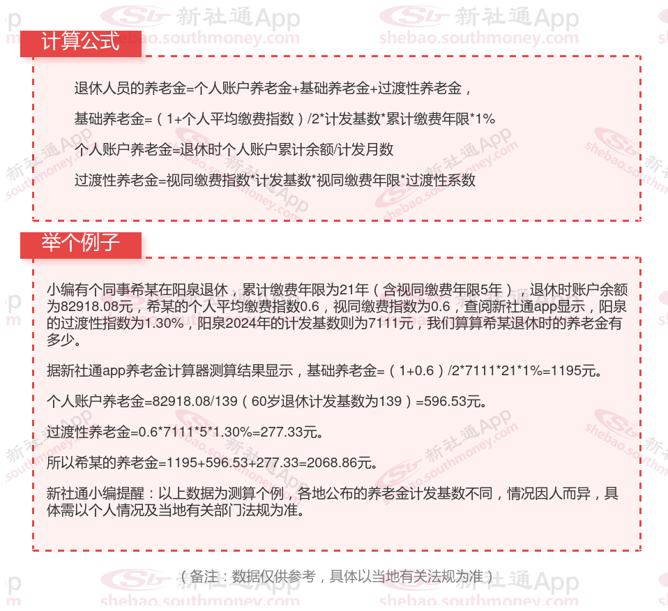 基本养老金=基础养老金+个人账户养老金+过渡性养老金=退休前一年全市职工月平均工资×20%(缴费年限不满15年的按15%)+个人账户本息和÷120+指数化月平均缴费工资×1997年底前缴费年限×1.4%。