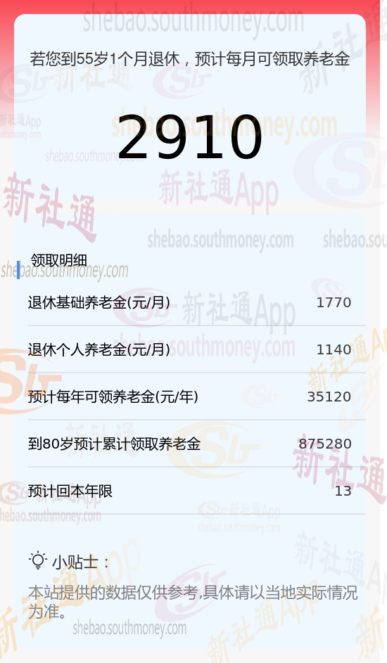 每月可领养老金总额:将基础养老金与个人养老金相加,每月可领取的养老金总额约为2910元(1770元+1140元)。