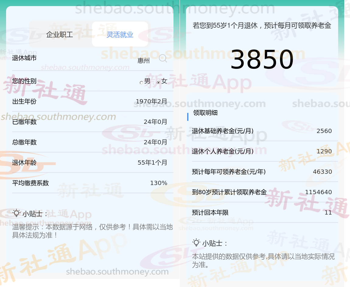 退休城市:惠州,性别:女,出生年份:1970,总缴年数24年,缴费档次:130%,新社通app养老金计算器所得: