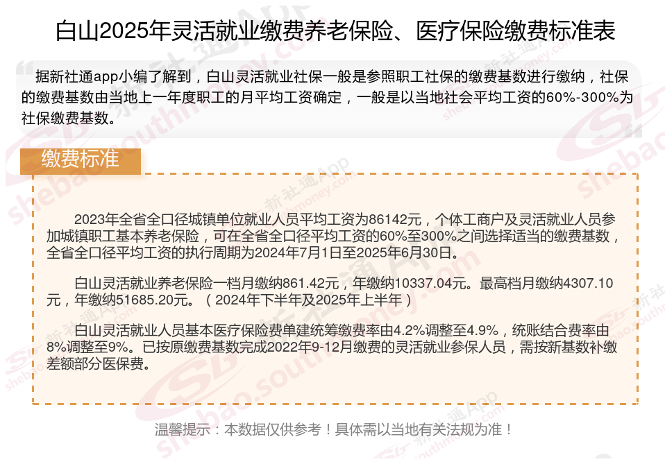 据新社通app数据显示,2024-2025年白山灵活就业人员养老保险的缴费标准: