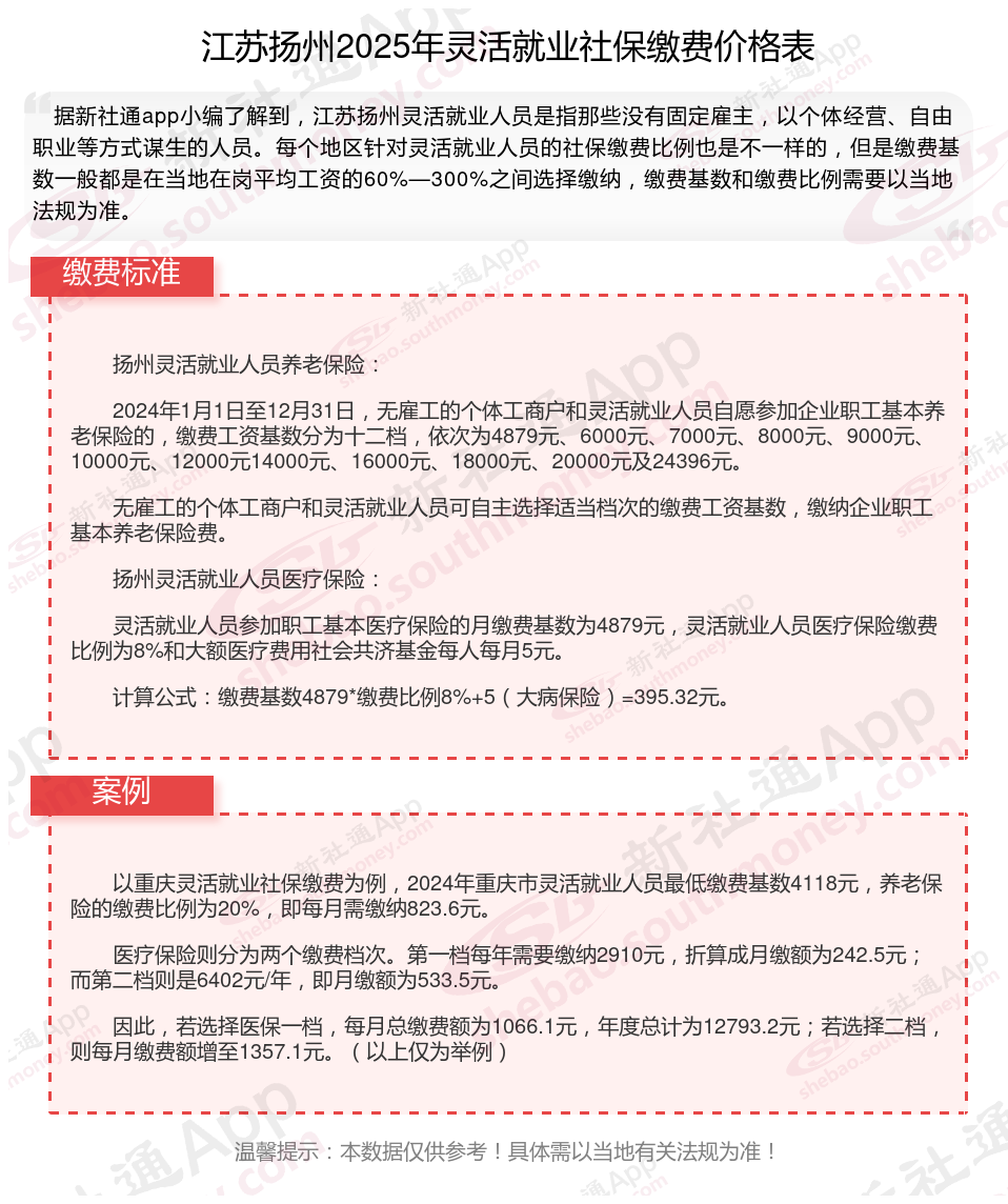 据新社通app数据显示,江苏扬州灵活就业人员养老缴费基数2024-2025年最新标准如下: