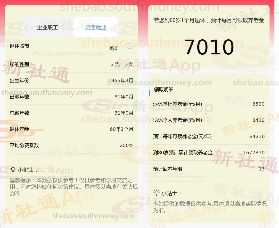 退休城市:咸阳,性别:男,出生年份:1965,总缴年数31年,缴费档次:200%,新社通app养老金计算器所得: