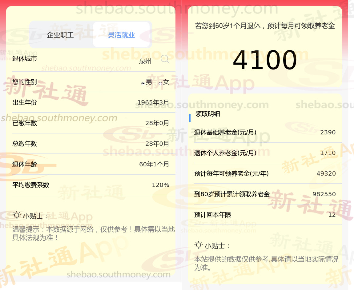 同事柯某退休城市在泉州,性别:男,出生年份:1965,总缴年数28年,缴费档次:120%,新社通app养老金计算器所得: