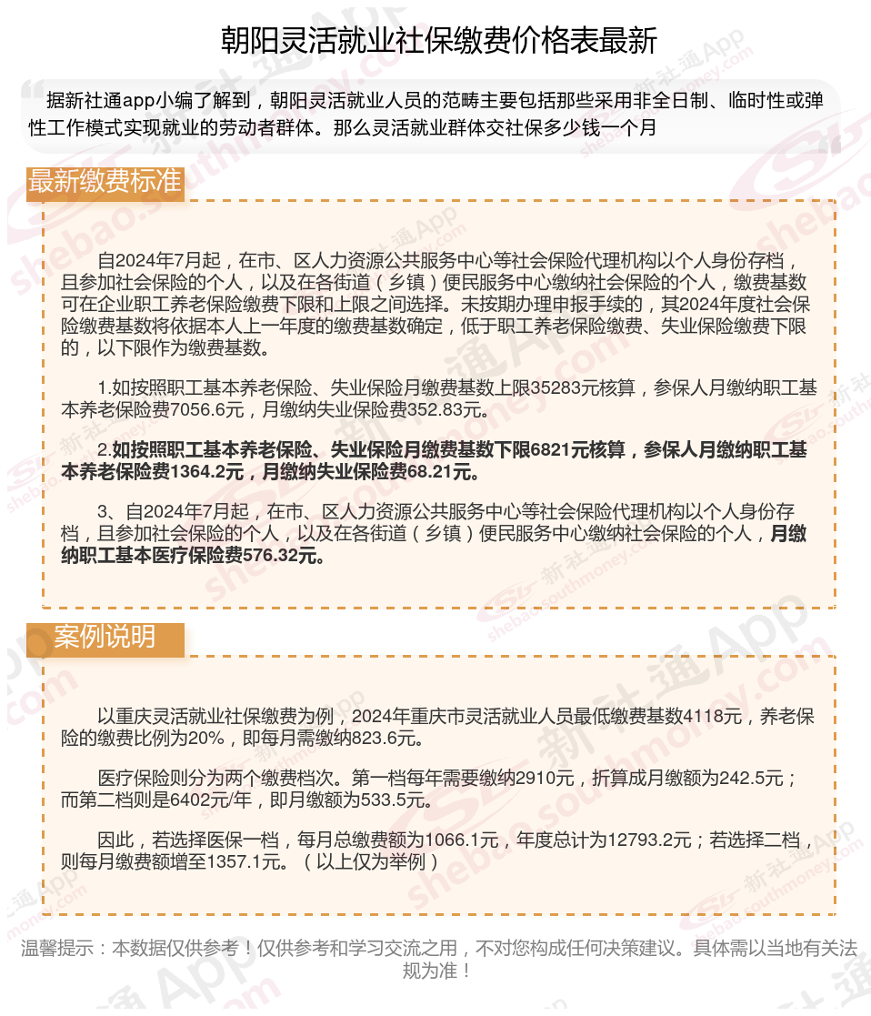 据新社通app数据显示,2024-2025年朝阳灵活就业人员养老保险的缴费标准: