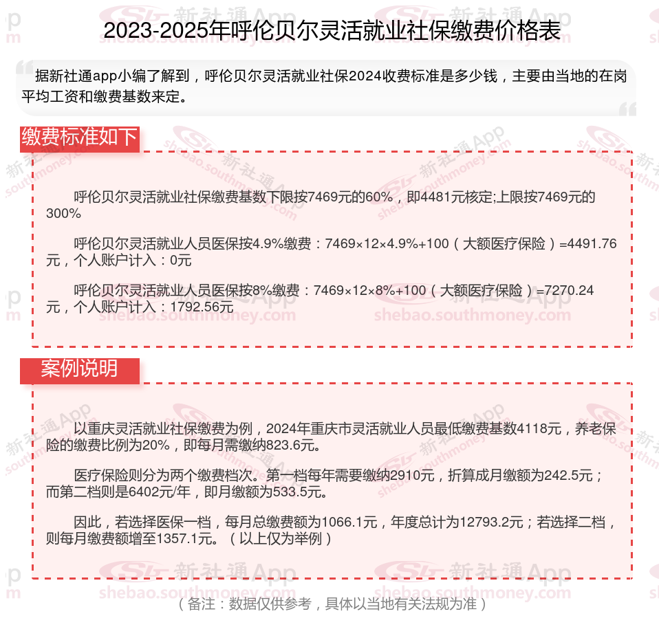 据新社通app数据显示,呼伦贝尔灵活就业养老保险缴费基数2024-2025年最新标准如下: