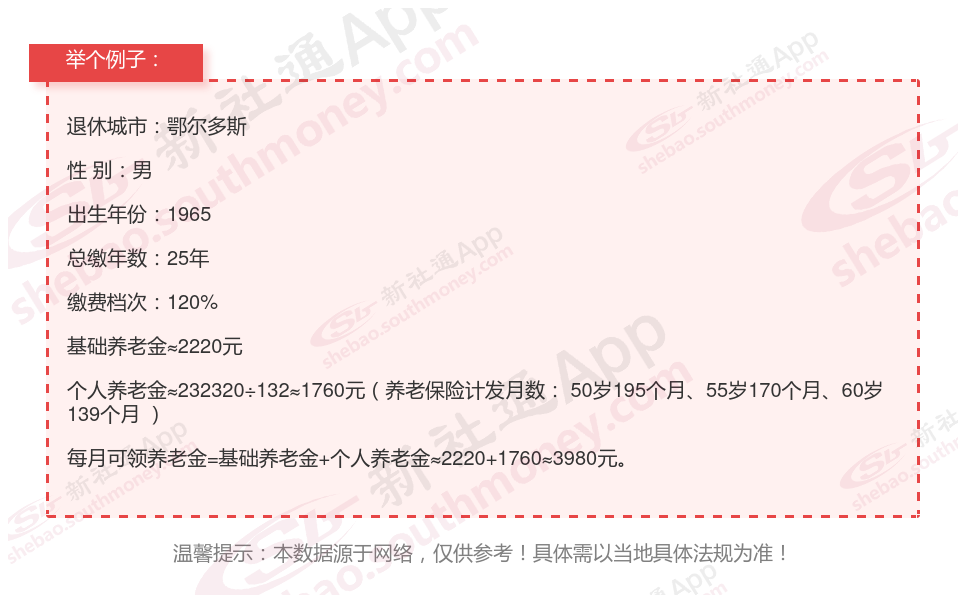 退休城市:鄂尔多斯,性别:男,出生年份:1965,总缴年数25年,缴费档次:120%,新社通app养老金计算器所得: