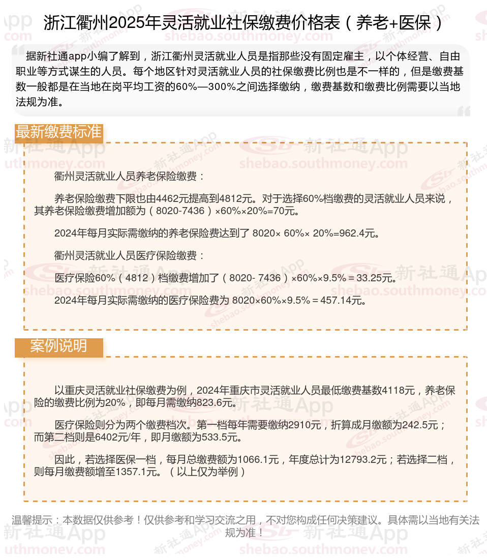 据新社通app数据显示,浙江衢州灵活就业人员养老保险缴费基数2024-2025年最新标准如下: