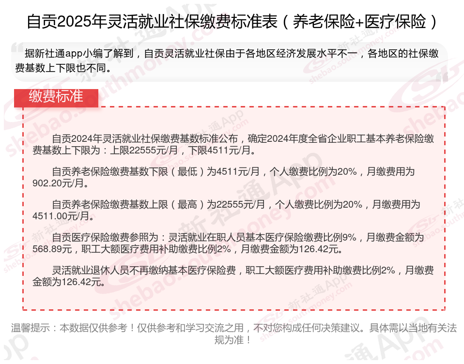 据新社通app数据显示,自贡灵活就业养老保险的缴费基数为:4511元。灵活就业人员参保缴费的比例为个人20%。