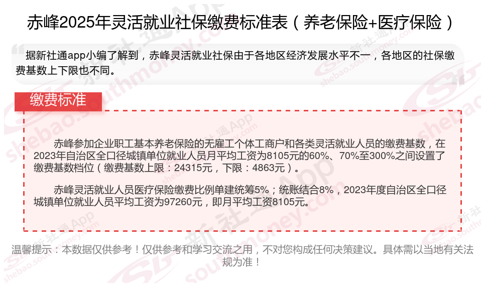 据新社通app数据显示,赤峰养老保险缴费基数2024-2025年最新标准如下: