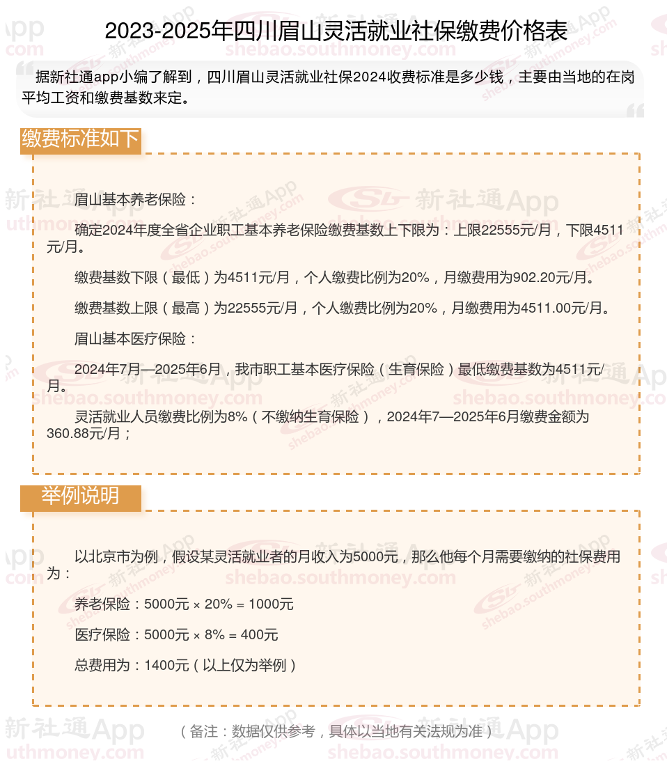 据新社通app数据显示,四川眉山灵活就业养老保险缴费基数2024-2025年最新标准如下: