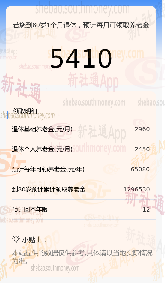 基础养老工资:基本养老金是我们退休后最主要的收入来源,由基本养老保险基金支付。它的计算公式为:每月基本养老金=(基本养老金计发基数+指数化月平均缴费工资)÷2×缴费年限×1%。通过公式计算出每月大约2960元。