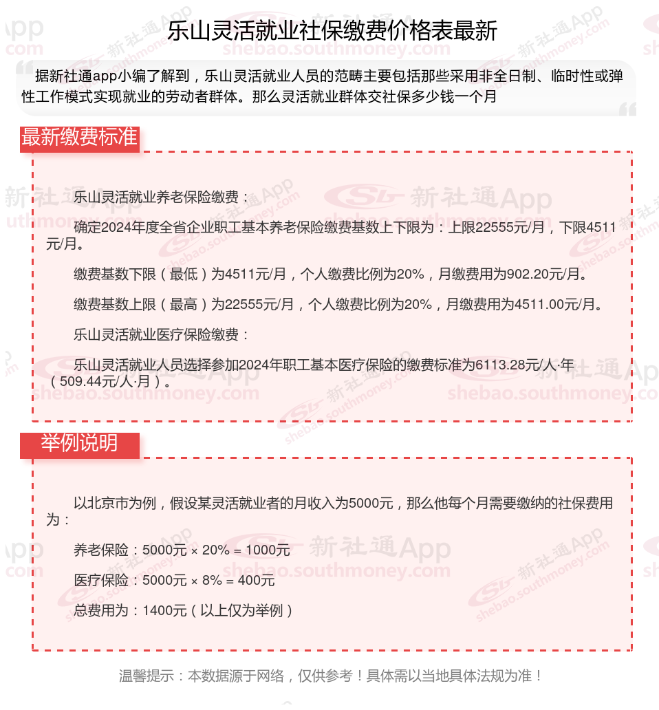 乐山社保缴费多少钱?下表是2024-2025年乐山社保费用明细参考,根据新社通app-社保缴费查询工具提供的最新数据如下:
