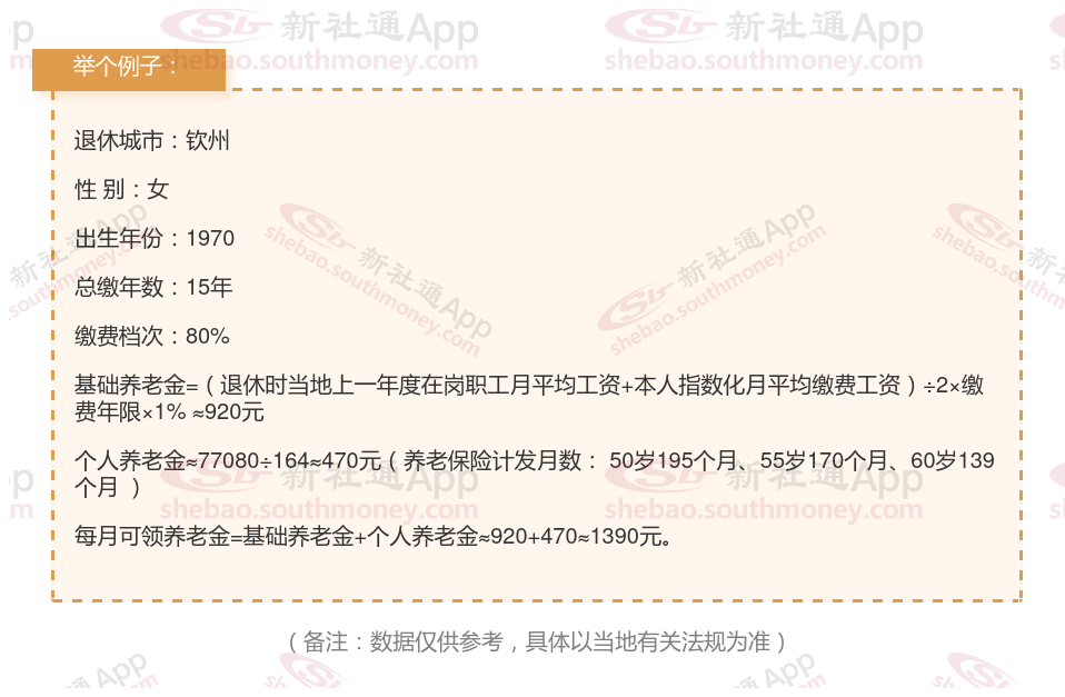 至于个人养老金,它是基于个人养老金账户余额77080元来计算的,并且与退休年龄相关,这里我们假设退休年龄对应的计发月数为164个月。因此,个人养老金的估算值为77080元除以164个月,结果大约是470元。