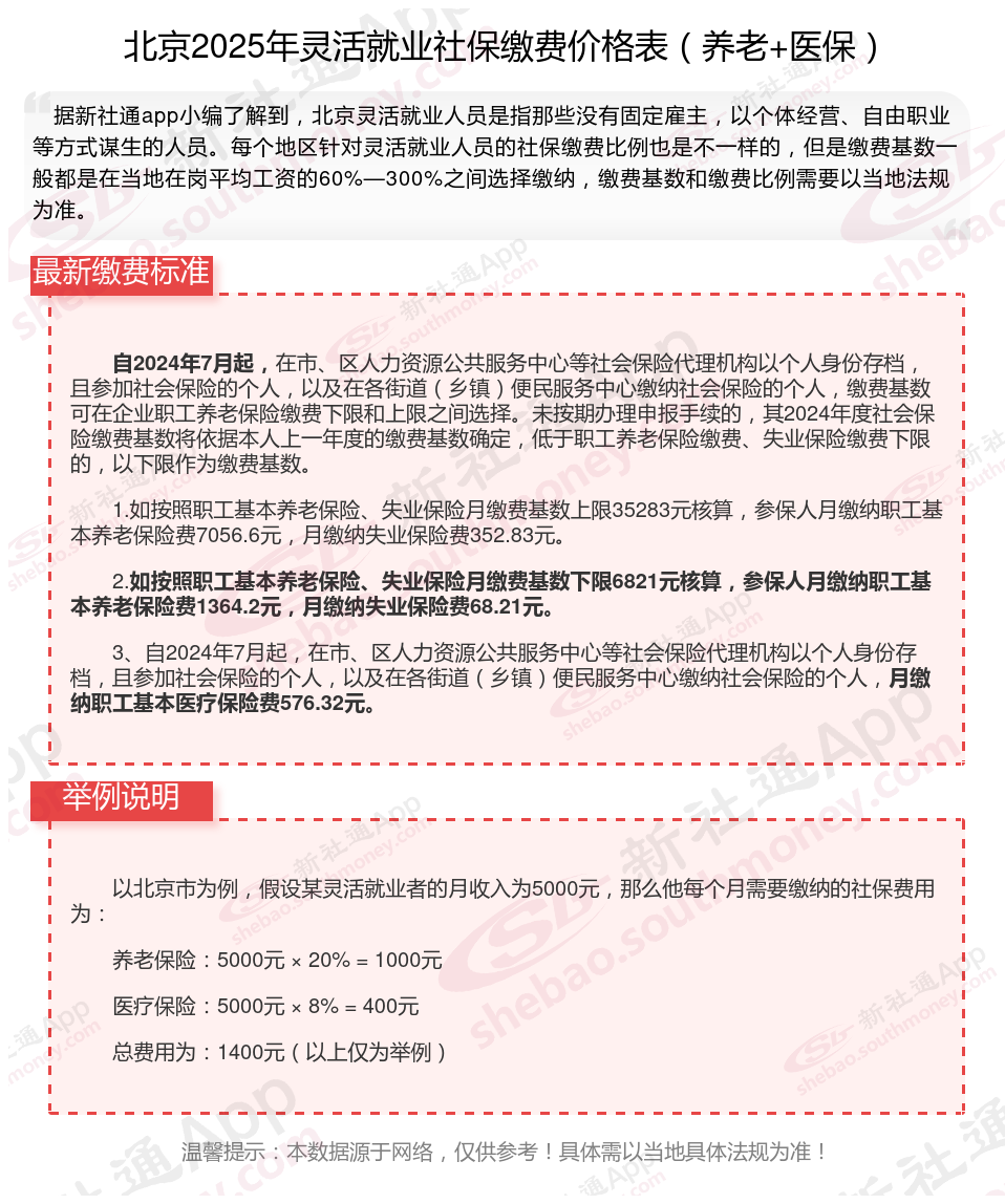 据新社通app数据显示,北京灵活就业养老保险缴费基数2024-2025年最新标准如下: